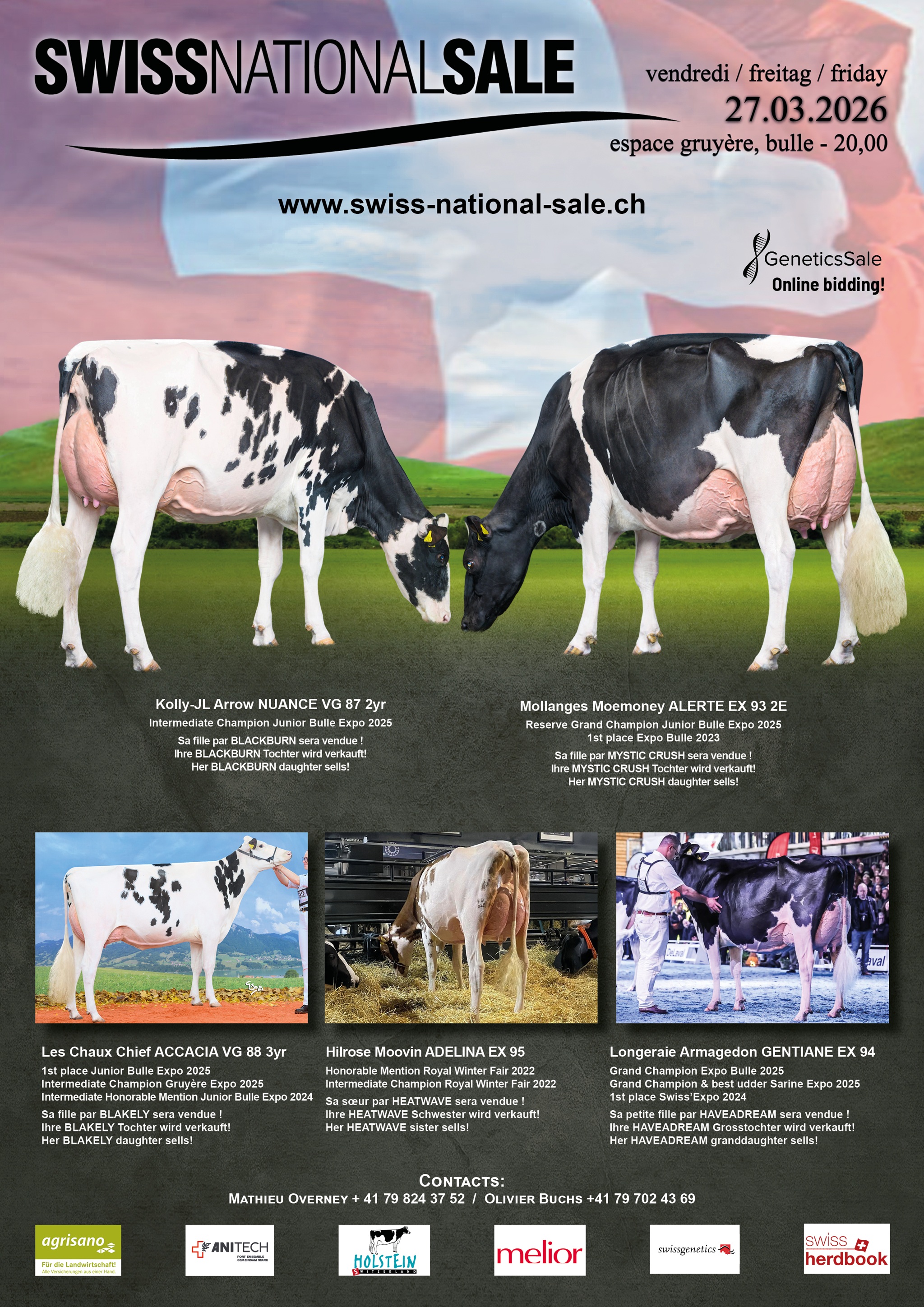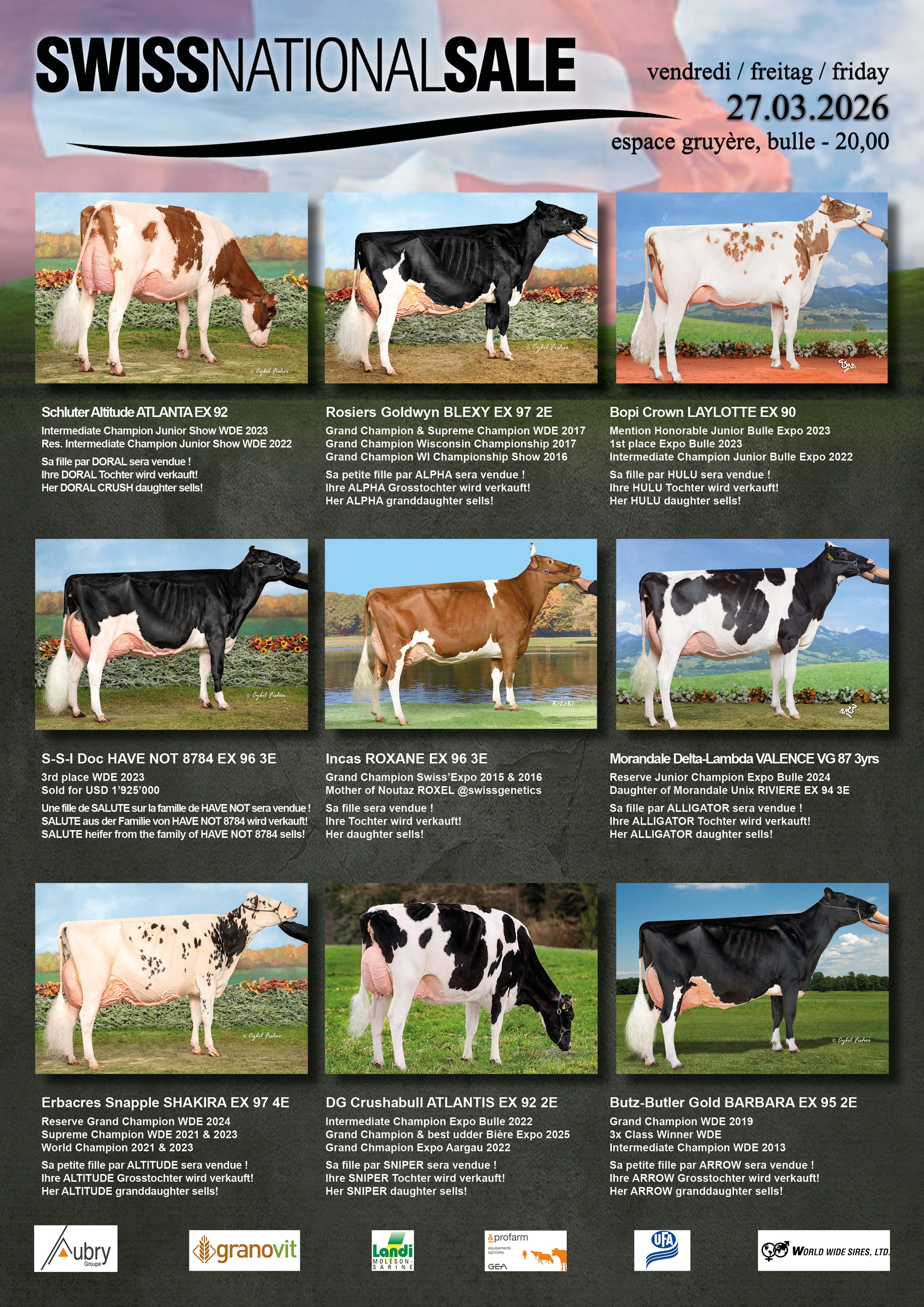 Aufgrund der momentan schwierigen sanitarischen Situation (BVD), müssen wir Ihnen leider mitteilen, dass für uns eine Durchführung des Swiss National Sale 2017 nicht möglich ist und wir die diesjährige Auktion absagen müssen. Wir sehen unter diesen Umständen keine Möglichkeit, den Verkäufern und Käufern die Plattform zu bieten, die für diese genetisch wertvollen Tiere nötig wäre. Wir möchten uns bei allen Züchtern die uns ihre Tiere zur Verfügung gestellt haben recht herzlich bedanken. Wir danken auch allen Sponsoren und Partnern, speziell der Expo Bulle sowie swissherdbook und Holstein Switzerland für das entgegengebrachte Vertrauen. Auf eine neue Edition Swiss National Sale 2018.